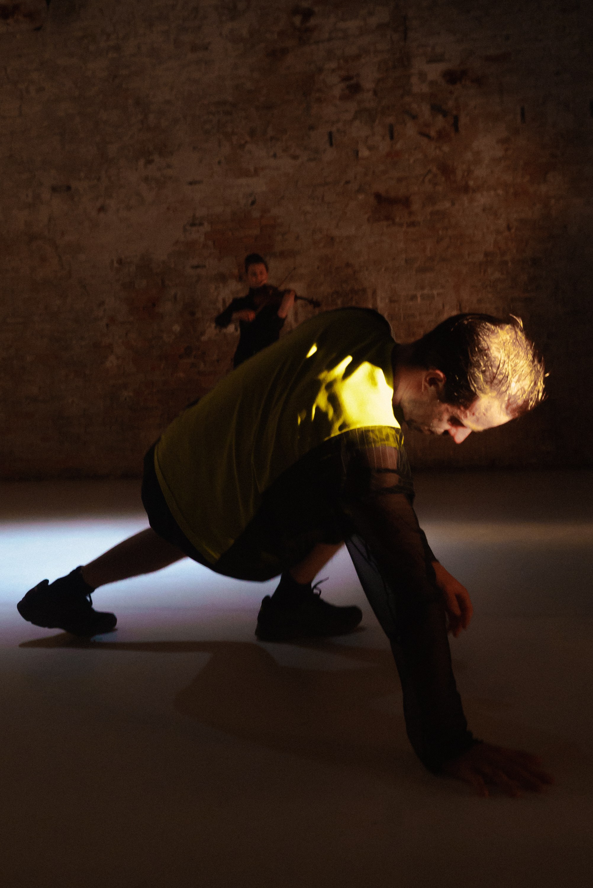 Crackle / Knistern is a choreographic arrangement of body, music, light and space: how can resonance be created between the elements and meanings become fluid between form and affect? A dancing body becomes a sculpture, while the violin stroke materializes in space. Here, choreographer and visual artist Daniela Georgieva creates a solo for dancer David Kummer that, in dialogue with contemporary jazz musician Julia Brüssel, shakes the boundaries of portraiture and (his own) authorship - a crackle between fragility, grace, form and eruption.